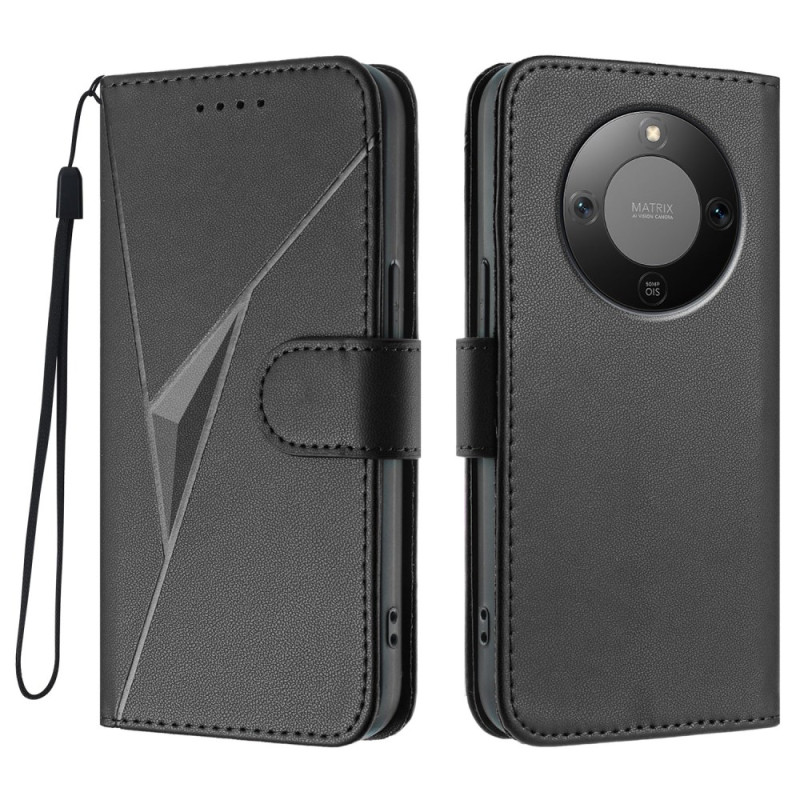 Elegant plånboksfodral med sofistikerat triangelmotiv, säker magnetstängning och praktisk handrem. Tillverkat av förstklassigt PU-läder och mjuk TPU för optimalt skydd. Rymmer upp till tre kort och kontanter.