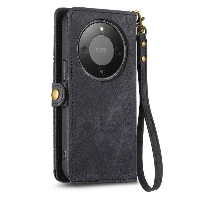 Elegant plånbok med geometriskt mönster som kombinerar PU-läder och TPU för optimalt skydd. Med 3 kortfack, 1 biljettficka, en extern ficka med dragkedja och en integrerad hållare. Den avtagbara handremmen gör den praktisk och snygg att bära.