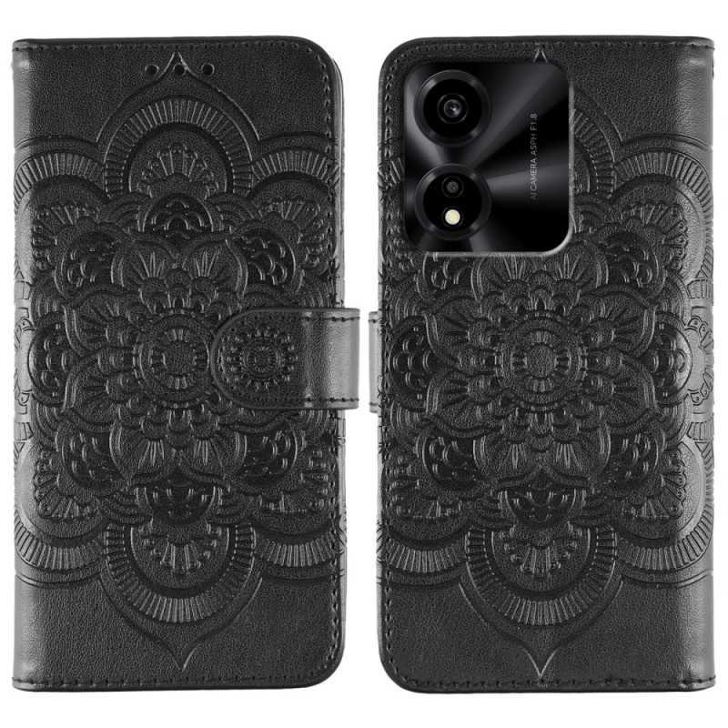 Plånboksfodral i PU-läder med tryckt mandalamotiv för Honor X5c Plus. Designad med elegans och funktionalitet i åtanke, erbjuder den robust skydd och unik stil. Med kortfack, ett anteckningsfack och en stativfunktion är det den perfekta lösningen för att kombinera funktionalitet och estetik.