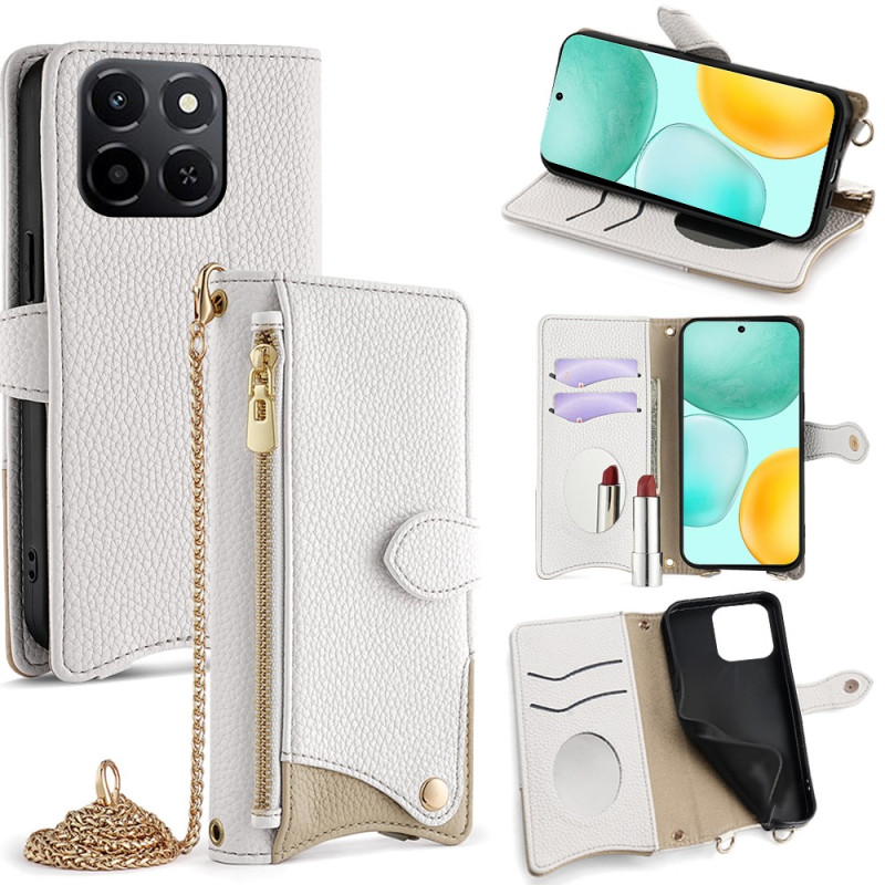 Snyggt plånboksfodral i texturerat PU-läder och mjukt TPU-skal för Honor X6c 4G. Unik oregelbunden fishtail-design, med 2 kortplatser, biljettfack, blixtlåsförsedd ficka och integrerad sminkspegel. Inkluderar en 1,2 m lång axelkedja.