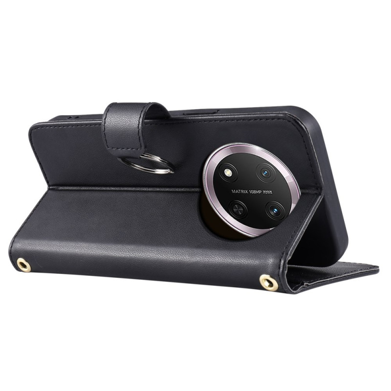 Elegant plånboksfodral med sofistikerad diamantdesign, distinkt ringspänne och multifunktionshållare. Med 5 kortplatser, en myntficka och två avtagbara remmar för att bära i handen eller över axeln.