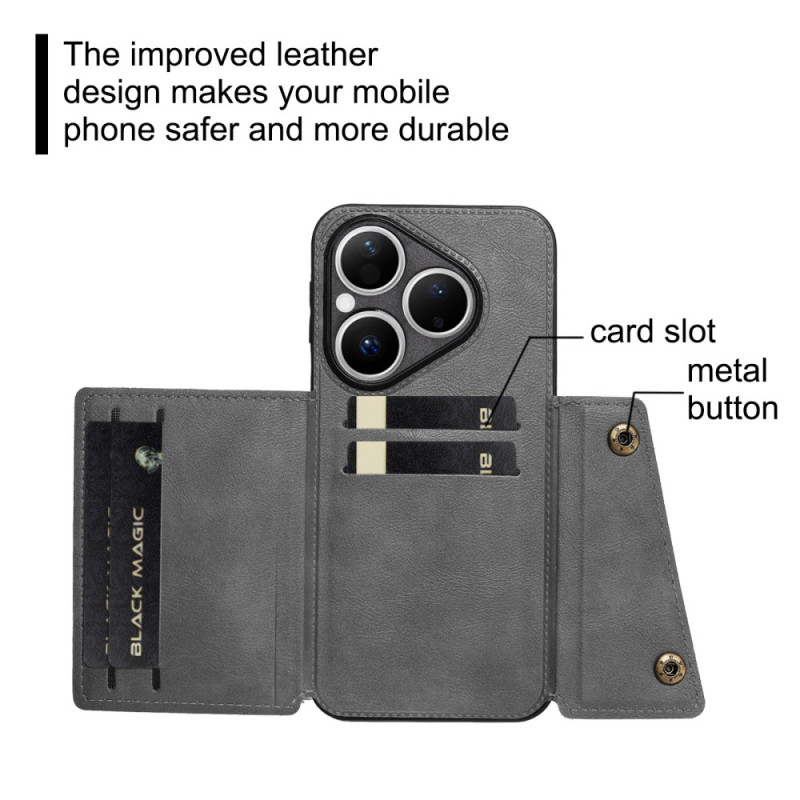 Multifunktionellt fodral för Huawei Pura 80 som kombinerar stil och funktionalitet. Med integrerade korthållare, ett justerbart stativ för handsfree-visning och en säker dubbel snäppstängning.