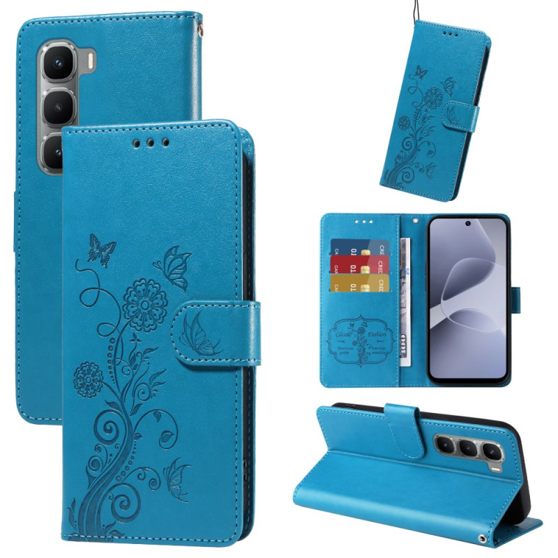 Elegant plånboksfodral till Infinix Hot 60 Pro 4G med graverat fjärils- och blommotiv. Med flera kortfack, integrerat handsfree-tittarstativ och praktisk handrem. Fullständigt skydd mot stötar och repor.