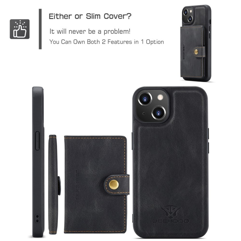 Upptäck JEEHOOD-fodralet för iPhone 13 mini: innovativ 2-i-1-design med avtagbar magnetisk korthållare. Flera kortplatser, integrerat handsfree-stöd och optimalt kameraskydd. Kompatibel med magnetiska tillbehör.