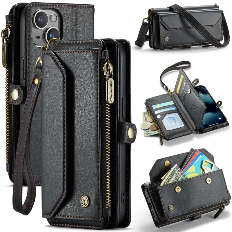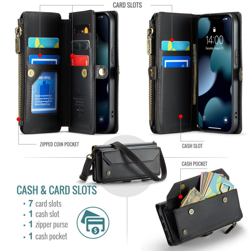 Upptäck CASEME multifunktionsfodral för iPhone 13 mini: RFID-skydd, 10 kortplatser, plånbok med dragkedja och avtagbar axelrem. Kombinera stil, säkerhet och funktionalitet med denna plånbok i premium PU-läder.