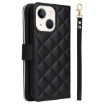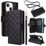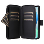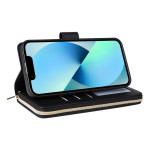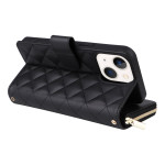 Elegant plånboksfodral i PU-läder med dragkedja för iPhone 13 mini. Raffinerad quiltad design, flera fack för kort och kontanter, extra ficka med dragkedja. Integrerad stativfunktion och justerbar axelrem för enkel bärning.