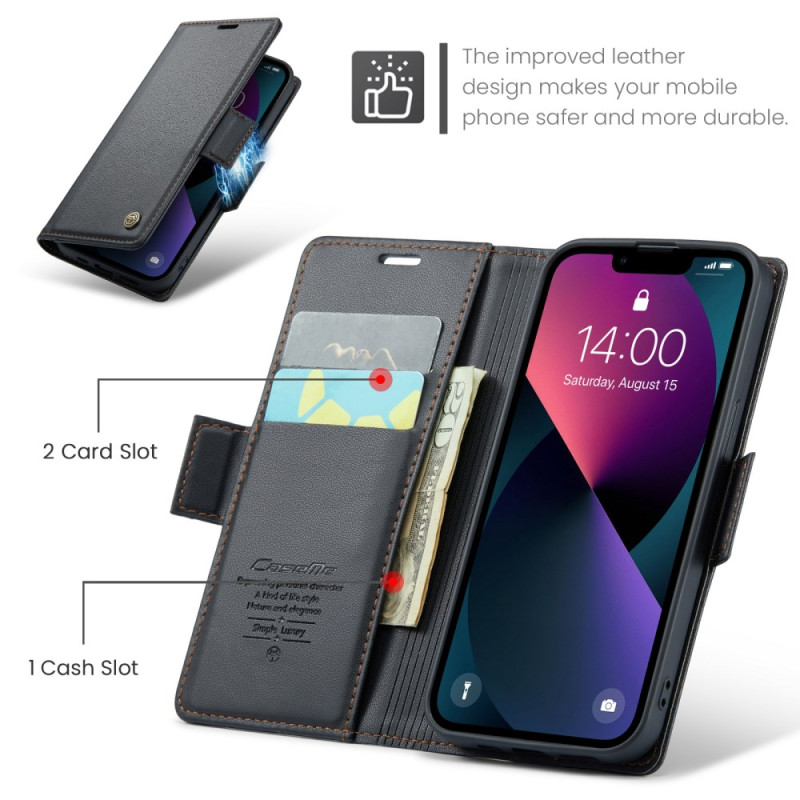 Skydda din iPhone 13 Mini med stil med detta multifunktionella plånboksfodral. Med avancerad RFID-blockeringsteknik skyddar det dina personuppgifter samtidigt som det har 3 kortfack och ett kontantfack.