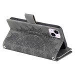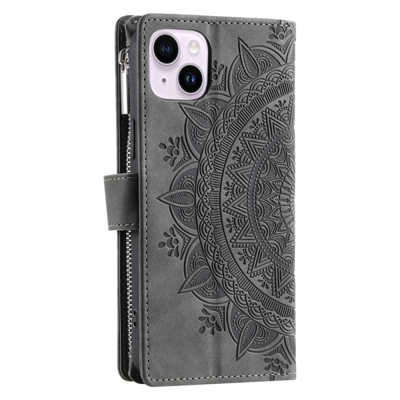 Snyggt plånboksfodral för iPhone 13 Mini med graverat mandalamotiv. Med flera kortplatser, ficka med dragkedja, säker magnetstängning och praktisk handrem. Integrerad stativfunktion för handsfree-visning.