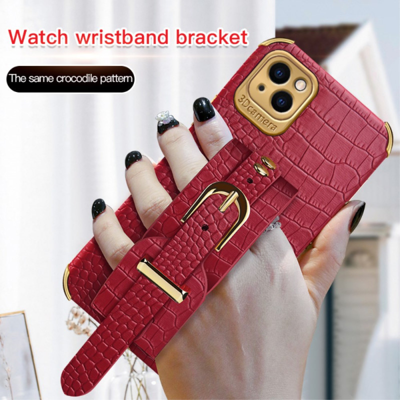 Skydda din iPhone 13 mini med stil med detta sofistikerade fodral med krokodiltextur. Den praktiska remmen gör att du kan bära telefonen på handleden för enkel och säker transport, samtidigt som den ger en touch av stil till din vardag.