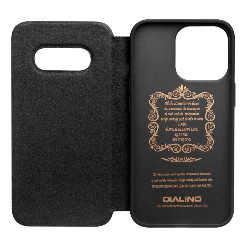 Elegans och skydd kombineras i detta QIALINO foliofodral för iPhone 13 minMinii. Det praktiska fönstret gör att du kan kontrollera tiden utan att öppna fodralet. Delikat textur och noggrann finish för optimal komfort och fullständigt skydd för din telefon.