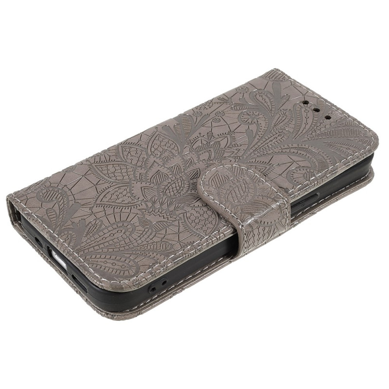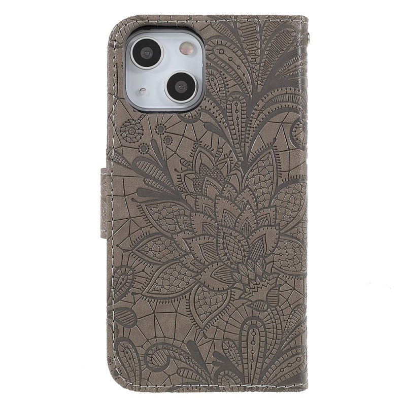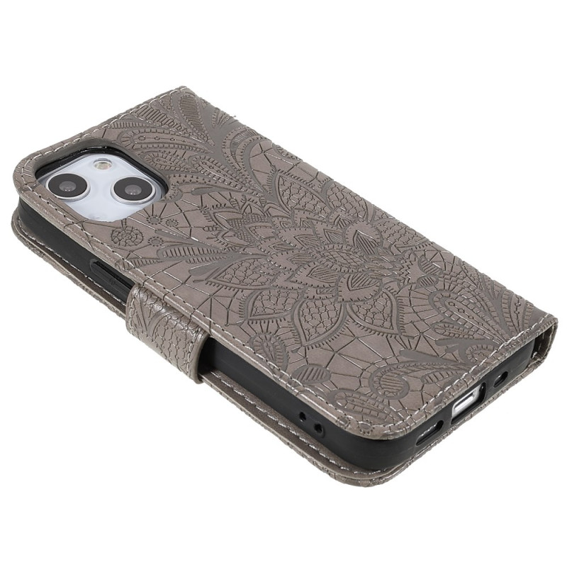 Upptäck detta eleganta plånboksfodral med lock och blommotiv i spets. Med flera kortplatser, en praktisk ståfunktion och en säker handledsrem kombinerar det raffinerad stil med optimalt skydd för din iPhone 13 mini.