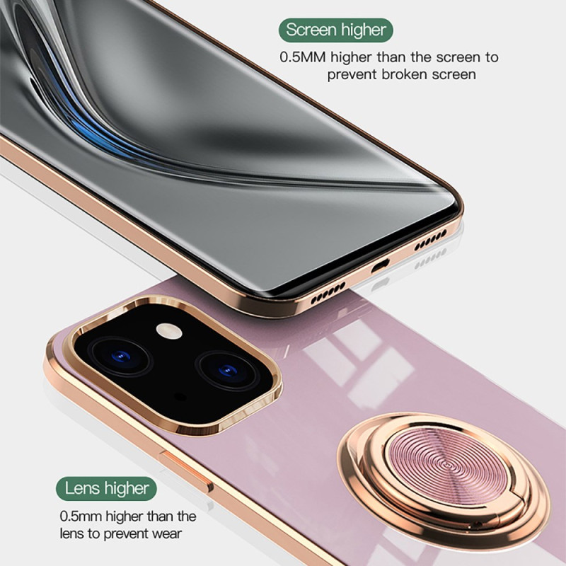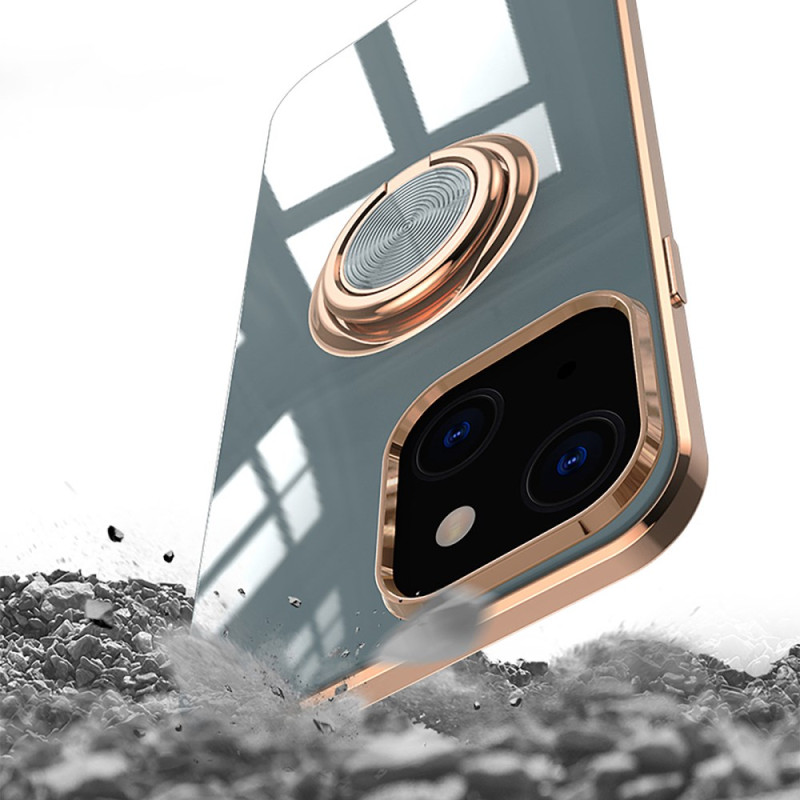 Skydda din iPhone 13 Mini med stil med detta premium TPU-fodral med elektrolytisk spegelfinish. Det integrerade ringfästet möjliggör handsfree-visning, medan metallplattan säkerställer kompatibilitet med magnetiska bilfästen.