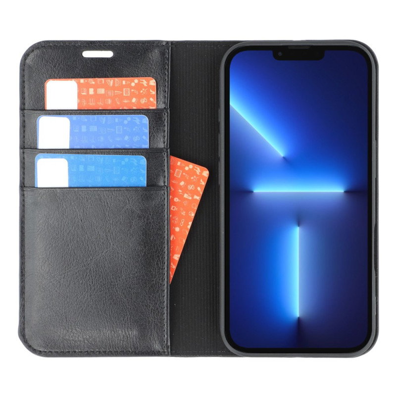 Snyggt plånboksfodral i äkta läder med split för iPhone 13 Pro Max. Med 3 kortfack, en anteckningsficka och ett praktiskt hopfällbart ställ. Säker magnetisk stängning för optimalt skydd av din telefon.
