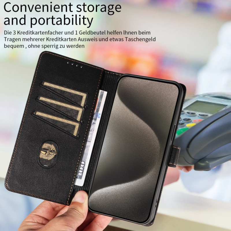 Skydda din iPhone 13 Pro Max med stil med detta plånboksfodral i litchitexturerat PU-läder. Med 3 kortplatser med RFID-blockering, en kontantficka och handsfree-stöd. Säker magnetisk stängning och fullt skydd mot stötar och repor.