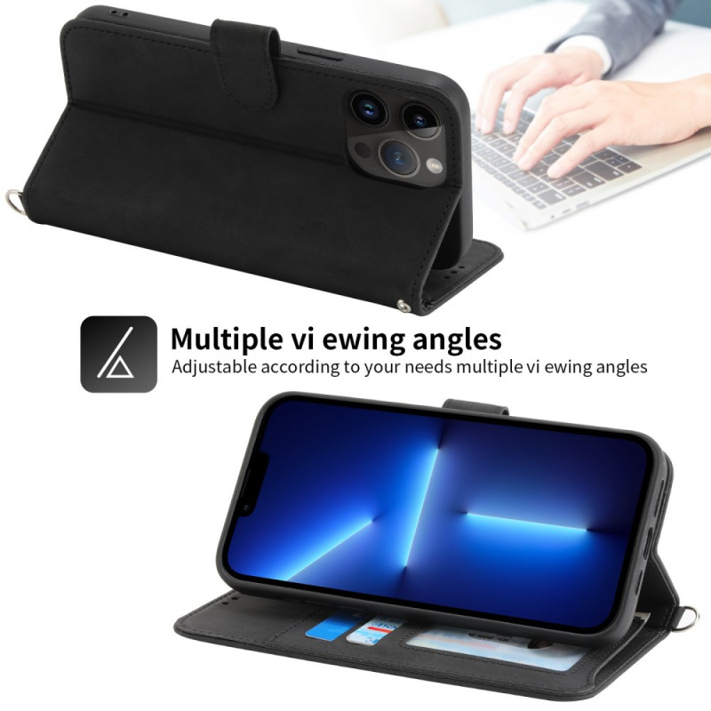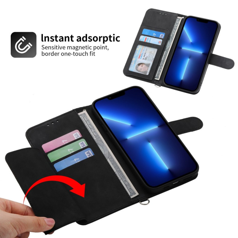 Upptäck detta eleganta plånboksfodral för iPhone 13 Pro Max 6,7 tum. Sofistikerad design med tryckt blommotiv, integrerad hållarfunktion och praktiska fack för kort och anteckningar. Inklusive axelrem och handrem.