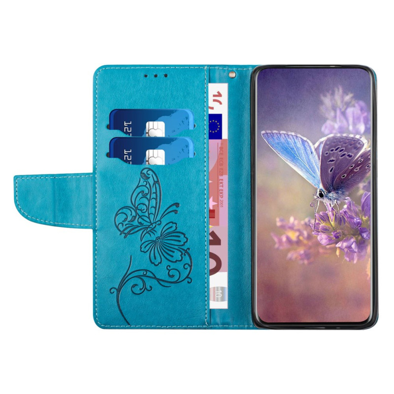 Elegant plånboksfodral med graverat fjärils- och blommotiv. Dubbelt skydd med magnetisk klaffdesign. Innehåller 2 kortplatser, 1 kontantficka, integrerad hållare och praktisk handrem för säker transport.