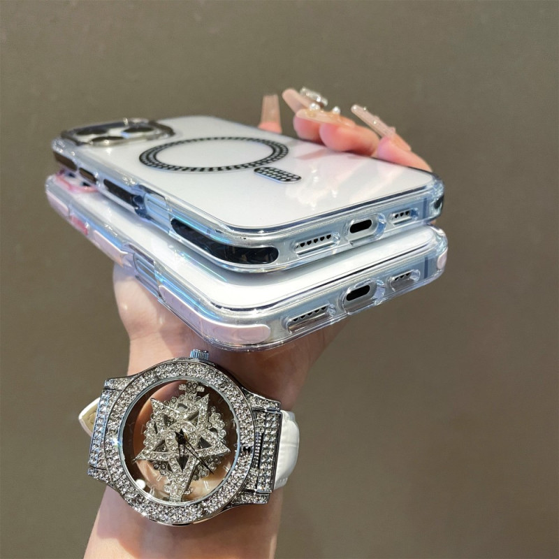 Upptäck vårt eleganta fodral för iPhone 15 Pro Max, som kombinerar robust skydd med raffinerad stil. Det är MagSafe-kompatibelt och erbjuder optimal säkerhet tack vare sin hybrid PC + TPU-struktur. Strassstenarna ger en touch av glamour, medan de förstärkta kanterna och de exakta utskärningarna garanterar perfekt funktionalitet.