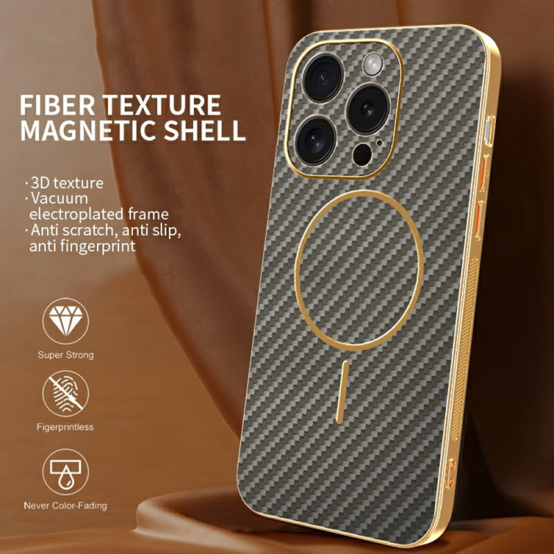 Upptäck vårt snygga skyddsfodral för iPhone 15 Pro. Tillverkat av flexibelt och hållbart TPU, med utmärkt stötdämpning och perfekt passform. Den högkvalitativa elektropläterade finishen förbättrar hållbarheten och estetiken, medan den strukturerade kolfiberbeläggningen avvisar fingeravtryck.