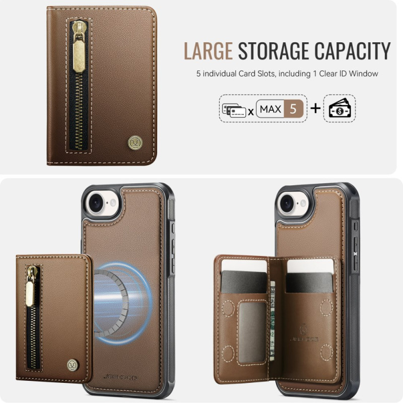 Upptäck JEEHOOD J12-fodralet för iPhone 17E / 16E: en avtagbar magnetisk plånbok med blixtlås, justerbart stativ och MagSafe-kompatibilitet. Organisera dina kort, pengar och foton samtidigt som du skyddar din telefon med stil.