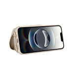 2-i-1 plånboksfodral för iPhone 17E / 16E med dragkedja och RFID-skydd. Snygg design i PU-läder och TPU, med avtagbar axelrem för handsfree-bärande. Integrerad stativfunktion för bekväm videovisning.