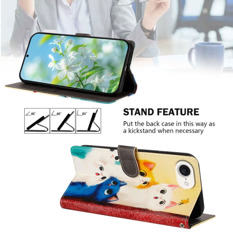 Protégez votre iPhone 17E / 16E avec style grâce à cet étui portefeuille au motif de chats colorés. Conception en cuir synthétique avec coque intérieure souple, fentes pour cartes, support réglable et dragonne amovible pour un usage quotidien pratique et élégant.