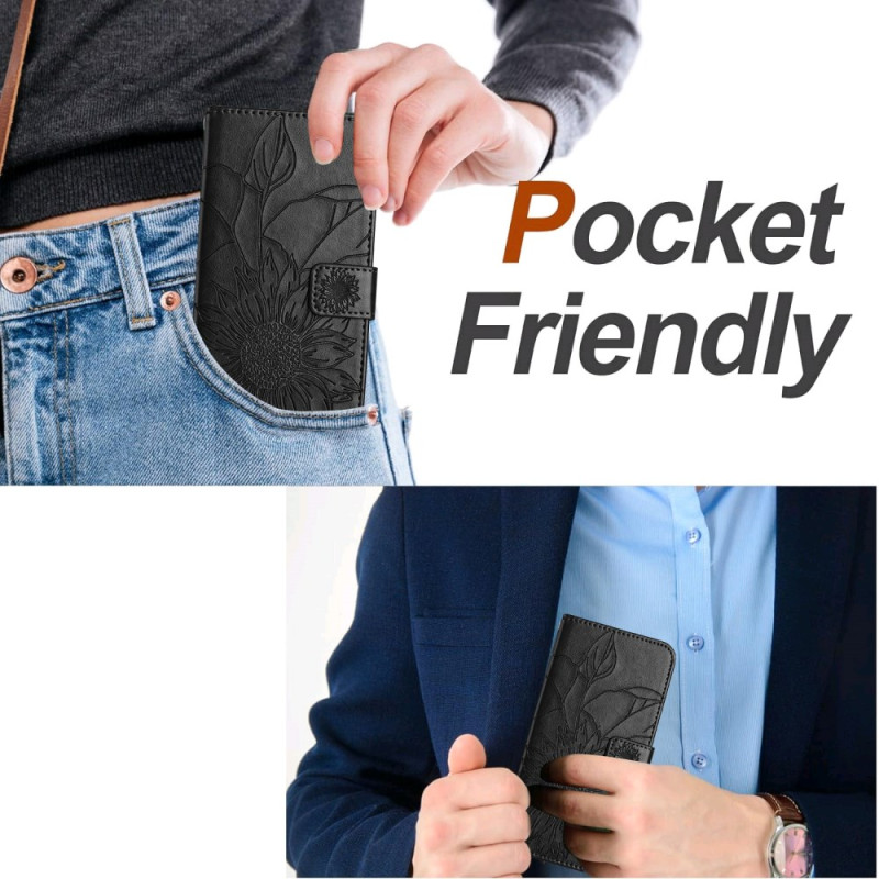 Elegant plånboksfodral i PU-läder med präglat solrosmotiv för iPhone 17E / 16E. Klaffdesign med standfunktion, kortfack och säker magnetstängning. Fullt skydd mot stötar och skal i vardagen.