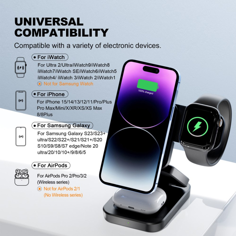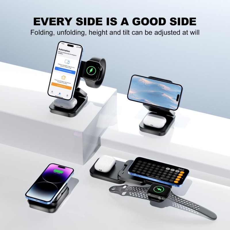 Vikbar 3-i-1 magnetisk trådlös laddare med snabbladdning på upp till 15 W. Denna kompakta och bärbara hållare är kompatibel med iPhone, Apple Watch och AirPods och har ett kraftfullt magnetfäste och vikbar design för enkel transport.