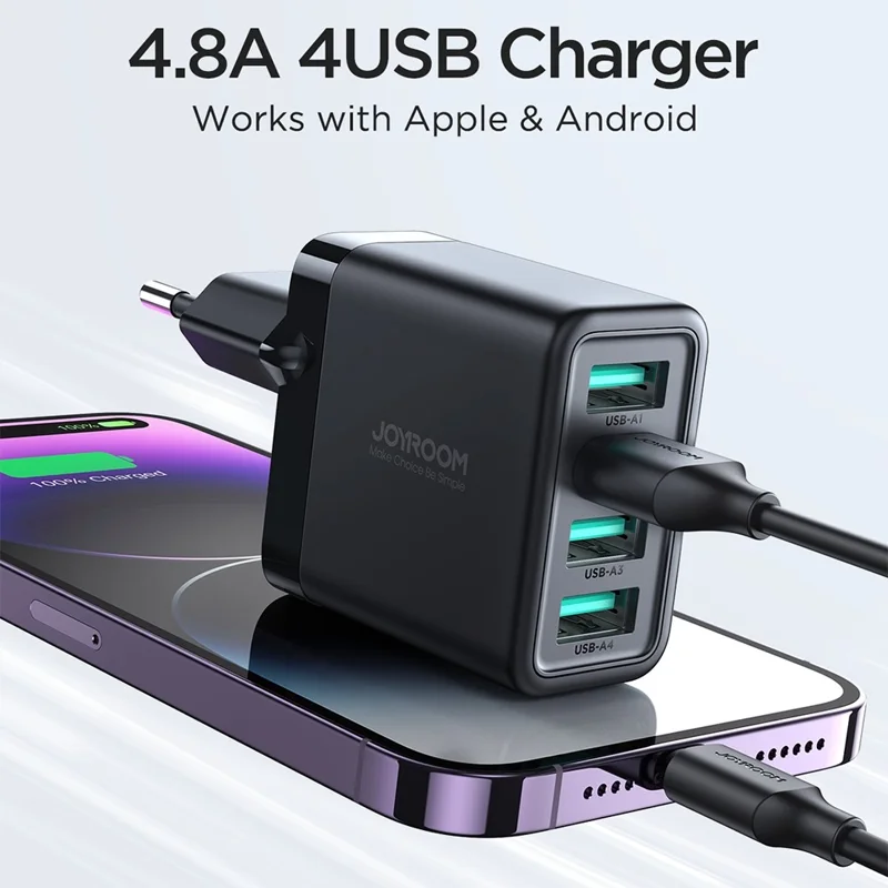 Den här kompakta och kraftfulla nätladdaren från JOYROOM kan strömförsörja flera enheter samtidigt.