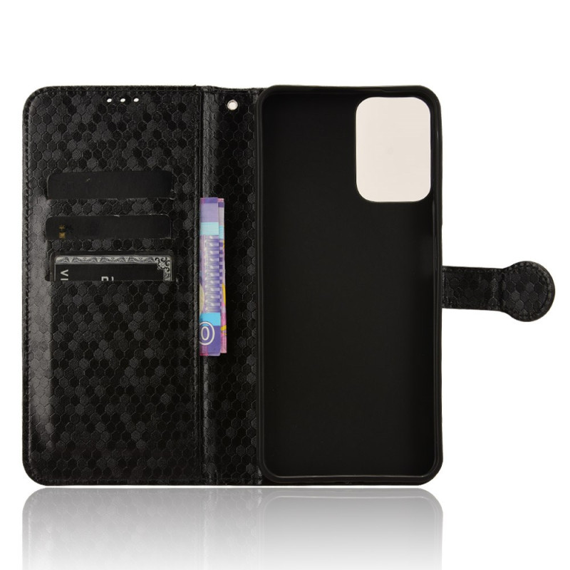 Den har ett justerbart ställ, kortfack och en praktisk handrem, allt i en raffinerad stil med tryckt prickmotiv.