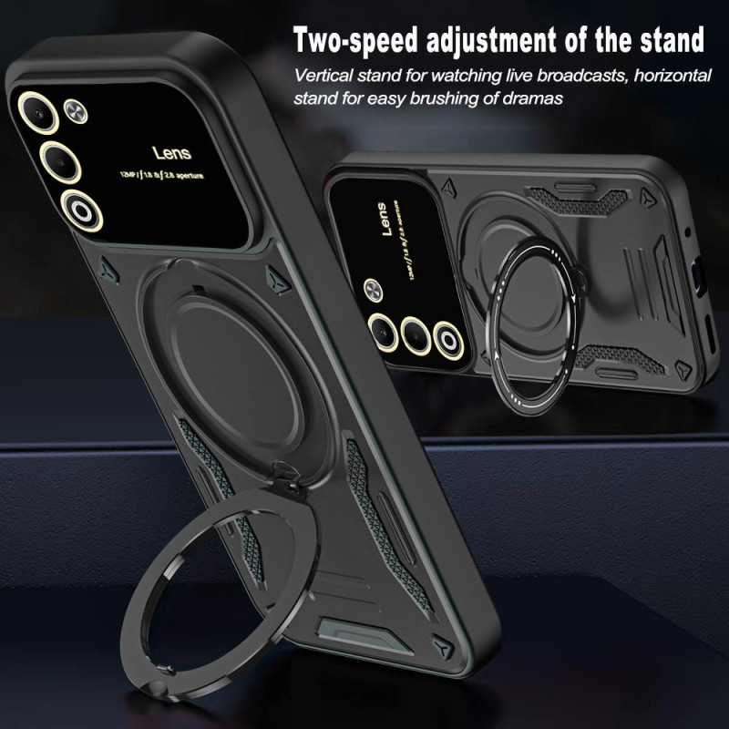 Skydda din Oppo A5 5G med detta innovativa fodral med en integrerad roterande magnetisk hållare. Njut av förstärkt dubbelt skydd i PC och TPU, MagSafe-kompatibilitet och full tillgång till alla funktioner.