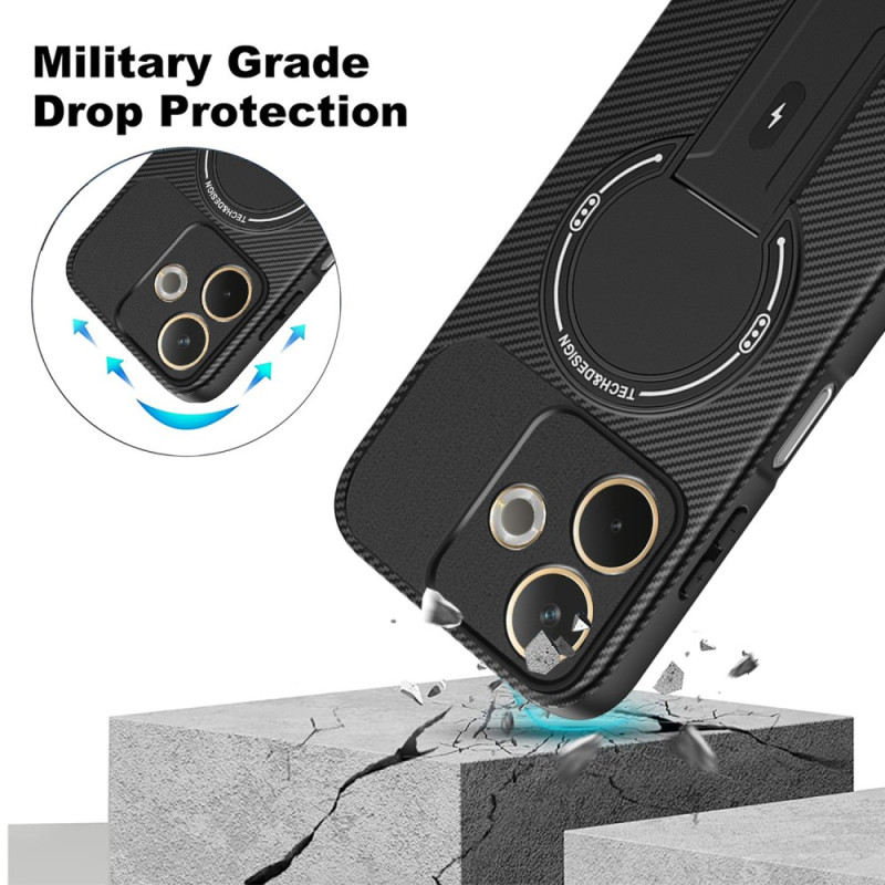 Militärt hybridskydd i TPU + PC med kolfiberstruktur. Integrerat infällbart fäste för handsfree-visning. Kompatibelt med magnetiskt bilfäste. Förhöjt skärm- och kameraskydd. Anti-rep-beläggning.