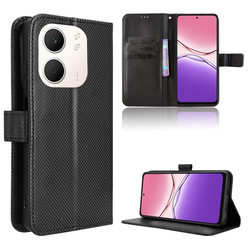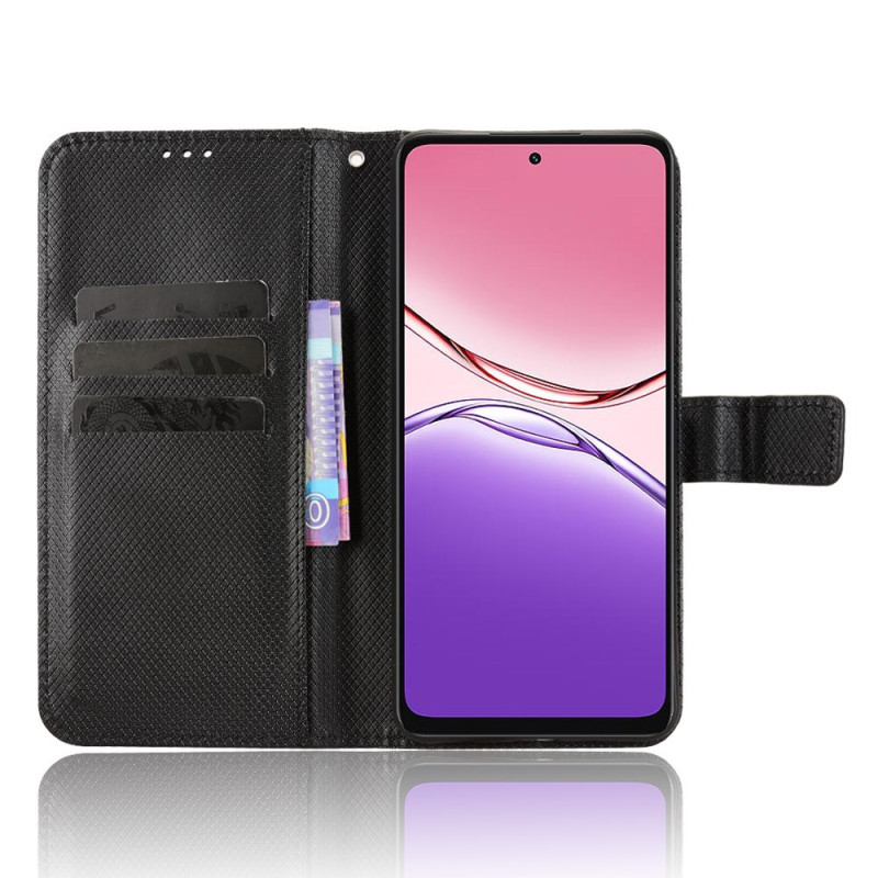 Elegant plånboksfodral med diamantstruktur för din Oppo A5X 4G. Med kortfack, kontantficka och praktisk handrem. Säker magnetisk stängning och integrerat vikbart stativ för handsfree-visning.
