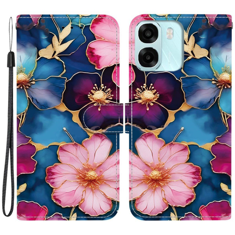 Skydda din Oppo A6 5G / A6X 5G / 4G med stil med det här plånboksfodralet med ett blått och guldfärgat blommotiv.