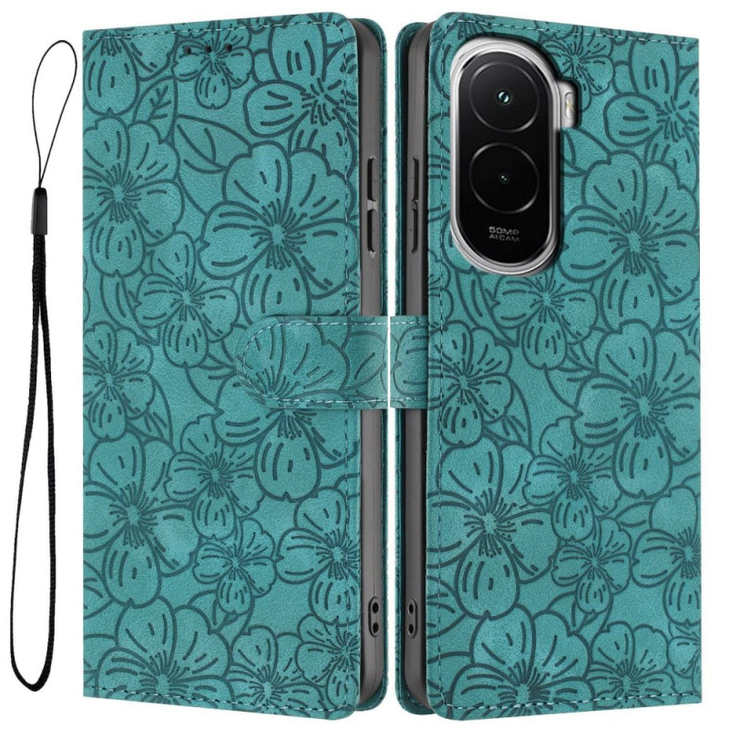 Étui à rabat élégant pour Xiaomi Poco M7 4G avec un magnifique motif fleurs de cerisier. Protection intégrale, portefeuille avec 3 emplacements pour cartes, fonction support ajustable et dragonne amovible pour un usage pratique au quotidien.