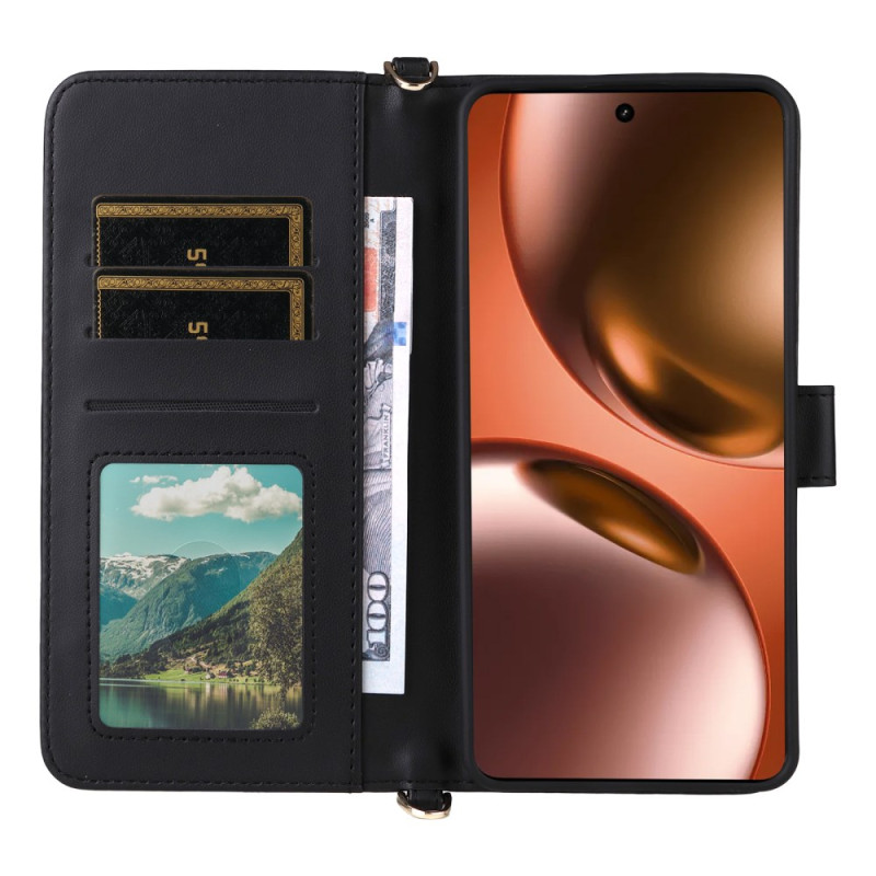 Snyggt plånboksfodral för Realme GT 7 5G med justerbart stativ, 6 kortplatser och säker magnetisk stängning. Levereras med justerbar axelrem och avtagbar handrem för mångsidig användning i vardagen.
