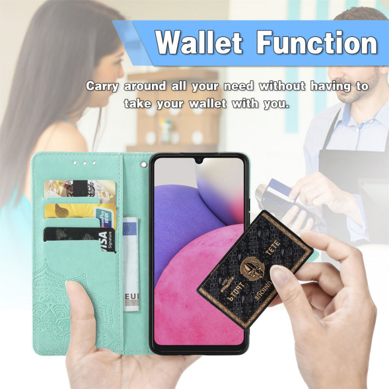 Ett vackert skydd för Samsung Galaxy A13, dekorerat med en medeltida mandala, som skyddar den helt och hållet samtidigt som den fungerar som plånbok.
