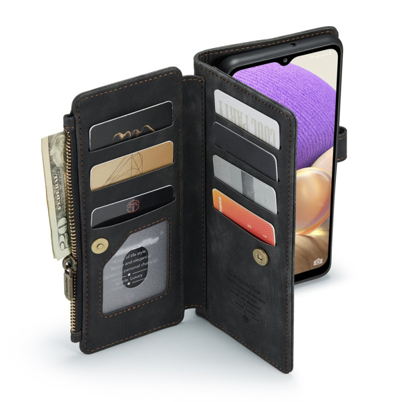 Upptäck vårt plånboksfodral i PU-läder för Samsung Galaxy A32 5G / M32 5G. Fodralet ger ett komplett skydd och har ett justerbart stativ, flera kortplatser, ett anteckningsfack och en extern ficka med dragkedja.