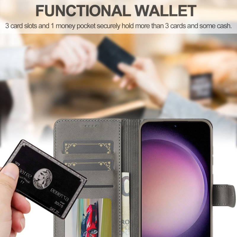 Snyggt plånboksfodral till Samsung Galaxy A57 5G med kalvläderstruktur. Med 2 kortfack, 1 fotofack och 1 kontantficka. Vikbart visningsstativ och säker magnetisk stängning för komplett skydd.
