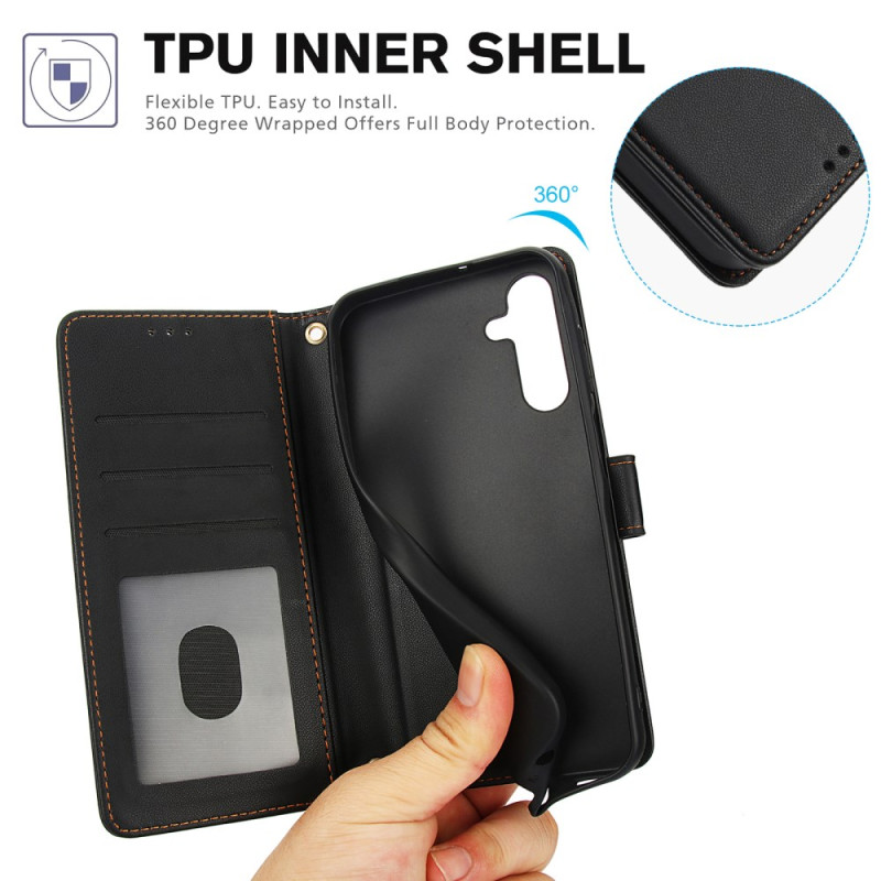 Skydda din Samsung Galaxy A57 5G med stil med detta plånboksfodral i premium PU-läder. Med 3 kortfack, en anteckningsficka och en standfunktion kombinerar det elegans och funktionalitet. Den avtagbara handledsremmen och det säkra magnetfästet ger ett komplett skydd för daglig användning.