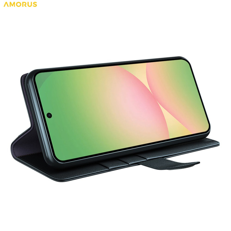 Plånboksfodral i äkta läder för Samsung Galaxy A57 5G. Elegant design med kalvläderstruktur, integrerat vikbart stativ, 3 kortfack och 1 sedelficka. Fullt skydd med säker magnetisk stängning.