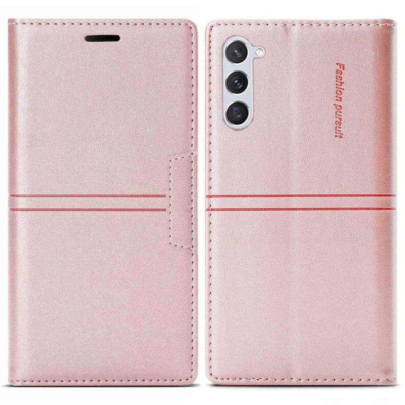 Din Samsung Galaxy S23 5G är väl skyddad med detta flipcover i läderstil med synliga sömmar och magnetlås.