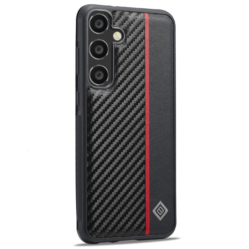 Protégez votre Samsung Galaxy S26 avec élégance grâce à cette coque haut de gamme au design fibre de carbone. Structure antichoc renforcée, finitions luxueuses avec logo en alliage d'aluminium et bande rouge distinctive. Protection intégrale avec rebords surélevés pour l'écran et la caméra.