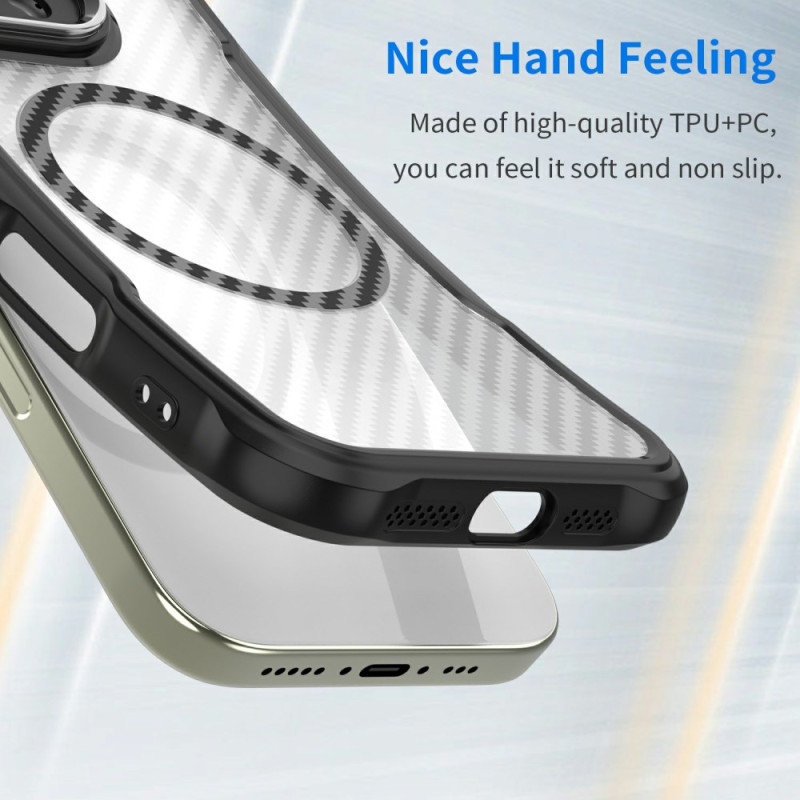Skydda din Samsung Galaxy S26 Ultra med detta eleganta MagSafe-kompatibla hybridfodral. Dess fingeravtrycksresistenta kolfiberstruktur kombinerar stil och styrka. Hållbar PC- och TPU-konstruktion för optimalt skydd mot skal och repor.