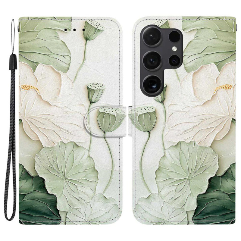 Protégez votre Samsung Galaxy S26 Ultra avec style grâce à cet étui portefeuille élégant orné d'un motif lotus. Doté de fentes pour cartes, d'un support pliable et d'une dragonne pratique, il allie fonctionnalité et design raffiné.