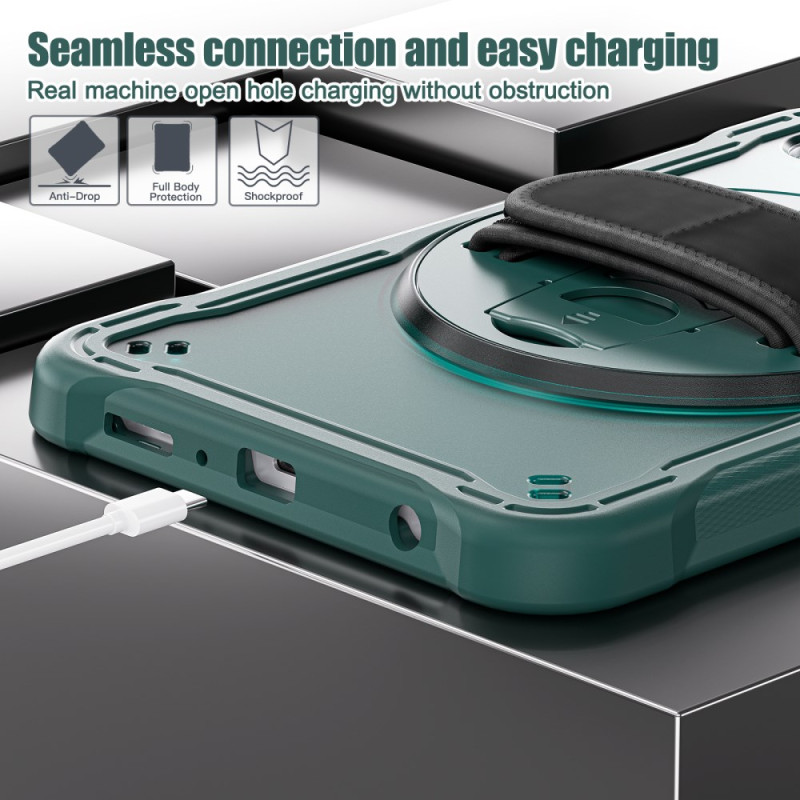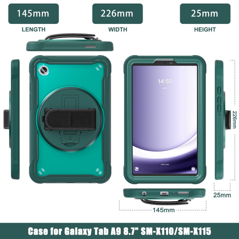 Detta fodral för Samsung Galaxy Tab A9 är utformat med ett 360-graders roterande stativ och en handrem.
