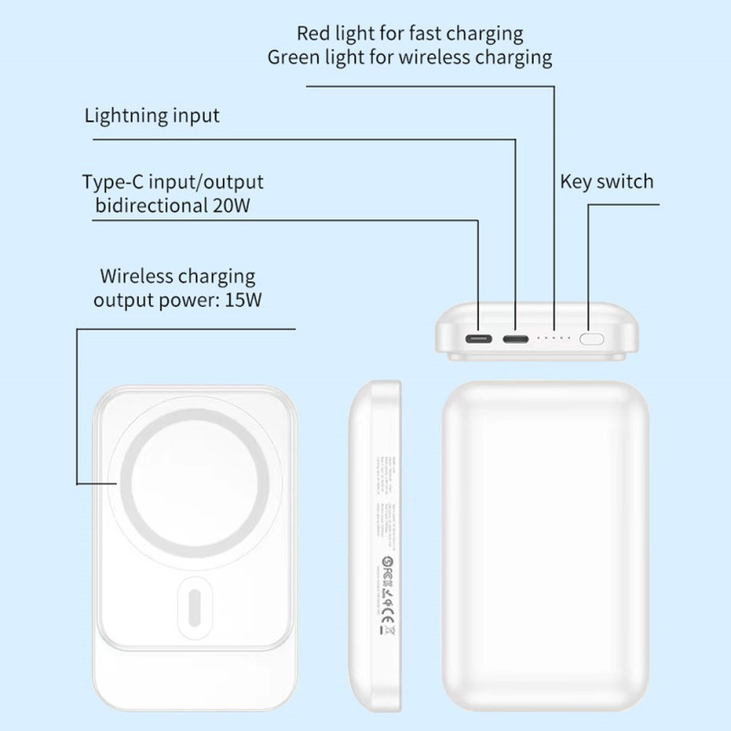 Kombinera prestanda och funktionalitet med detta magnetiska 10000mAh externa batteri. Det har snabb trådlös laddning på upp till 15 W och fästs säkert på baksidan av kompatibla telefoner.