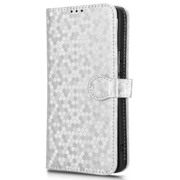 Elegant plånboksfodral i PU-läder med präglat prickmotiv. Justerbar stativfunktion för optimal handsfree-visning. Integrerade fickor för kort och anteckningar. Praktisk handrem medföljer för säker bärning.