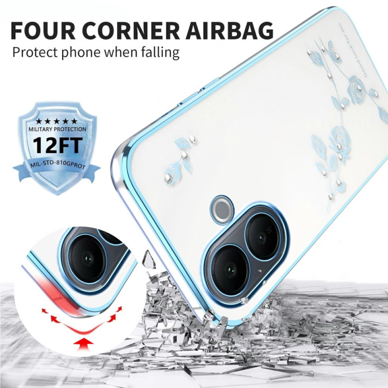 Skydda din Vivo V60 Lite med stil med detta fodral prytt med gnistrande strass och handgjorda eviga blommor. Tillverkat av militärklassad TPU med elektropläterade kanter ger det optimalt skydd.