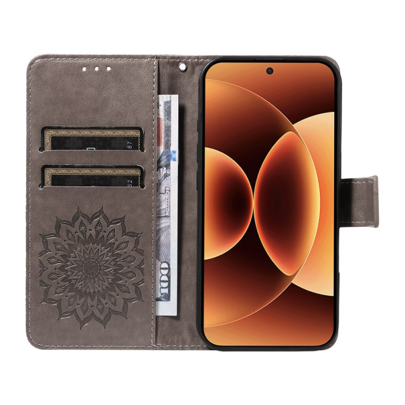 Elegant PU-läderfodral med präglat solrosmotiv som ger ett robust skydd och praktiska funktioner. Innehåller kortfack, anteckningsfack, hållarfunktion och handledsrem, allt i en raffinerad design som kombinerar stil och funktionalitet.