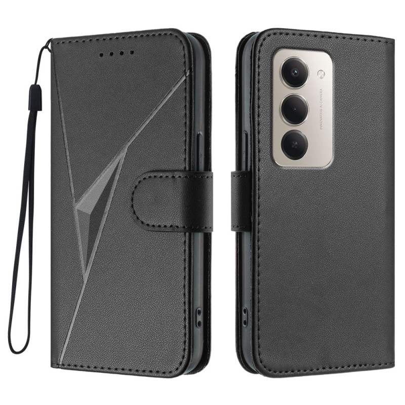 Upptäck vårt eleganta PU läderfodral för Xiaomi Redmi 15 4G / 5G. Med magnetstängning, snyggt triangelmönster och klassisk plånboksdesign erbjuder det ett komplett skydd samtidigt som det är praktiskt. Fodralet har plats för tre kort och pengar, stötskydd och en handledsrem för extra säkerhet.